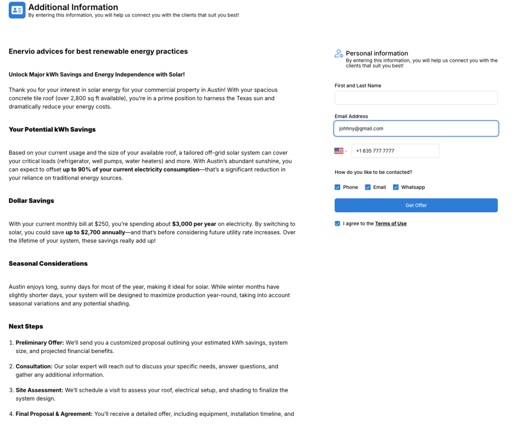 Enervio’s approach: A clean, intuitive interface that works seamlessly for both sales teams and end clients. Every step, from inputting property data to generating offers, is optimized for speed.